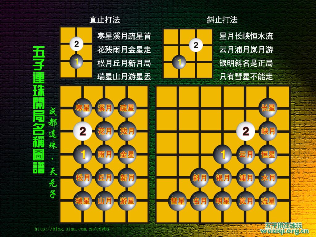 五子连珠开局名称图谱 (点此查看大图) 该图谱尺寸为1024*768像素,可做电脑桌面使用,便于刚接触五子棋的朋友下棋的时候随时查对。 图片作者:天元子 欢迎访问天元子的新浪博客:http://blog.sina.com.cn/u/1215743667