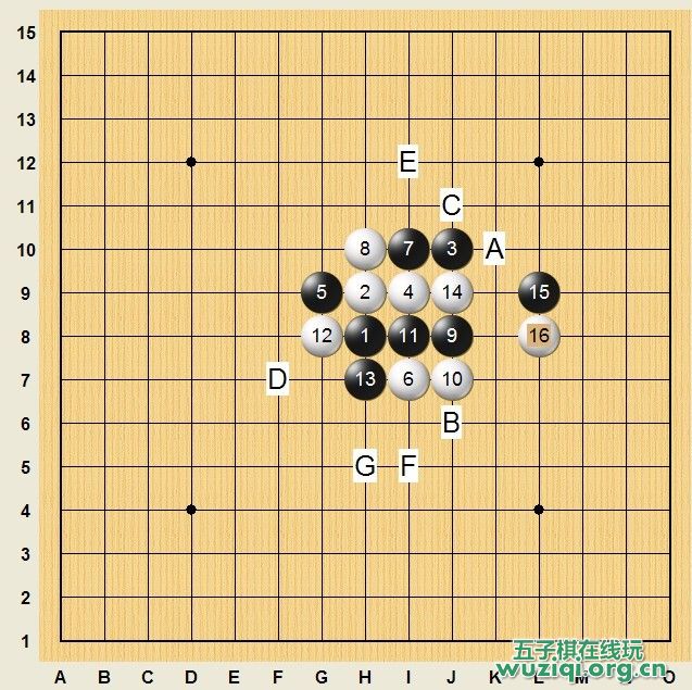 到17手我们该怎么去选点?这里有很多选择。如下图,这里有A—G 等7个选点,每个选点的思路都有自己的想法,哪个点是最好的,或者那个点是最理智的?