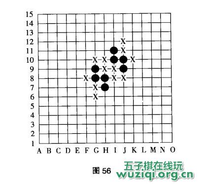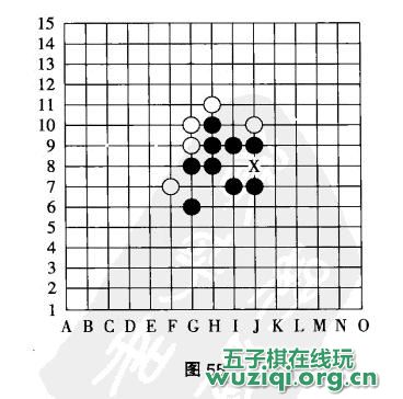图55中的三层禁手就稍微复杂些,X点是三三禁手,您能分析出来吧。