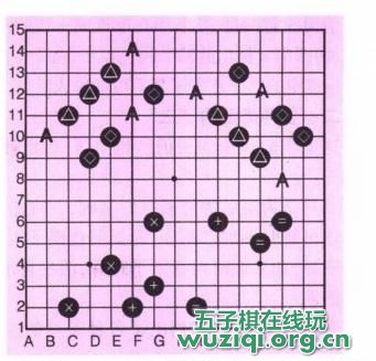 图中0标出的三称为连三,其后续手段是在两端的A点着子将形成必胜的活四。图中.标出的三称跳三,如果在中间的A点再着一同色棋子.也将形成活四。从棋子的排列方向上三也有阳线上的三《图3-1-3 )和阴线上的三《图3一14)。两图中由x、十、二标出的三子组合则不能称为活三,因为无论在其间的哪一点再加上一子也不能成为活四。